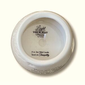 8 oz candle holder is made from ceramic and features a 100% soy wax candle with a tranquility scent.