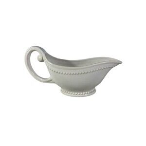 The Pavillion by Princess House Gravy Boat is a beautifully designed ceramic piece with a dotted pattern in cream or off white color, standing at 5 inches tall. Made in China, this original gravy boat adds a touch of elegance to any dining table. Perfect for serving gravy or sauce in style, this piece is a must-have for your fine dinnerware collection.