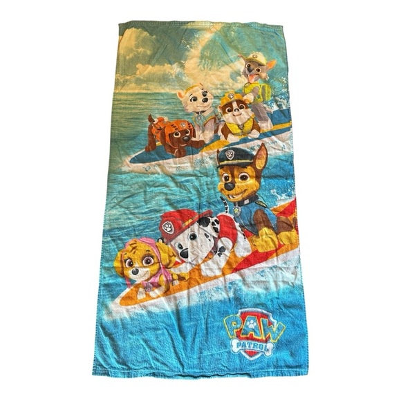 Join the Paw Patrol team on this vibrant towel. Features favorite characters on a blue and red background. Perfect for beach fun.