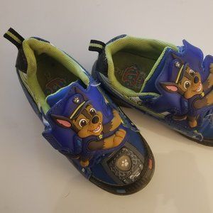 Paw Patrol (Chase) version boys running shoe, Blue w/ Green accent, Blue Lights, size 9. Velcro wrap closure, light flash when running, jumping and walking on both shoes. Design is Paw Patrol car with Chase the dog on the closure. lightly worn