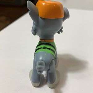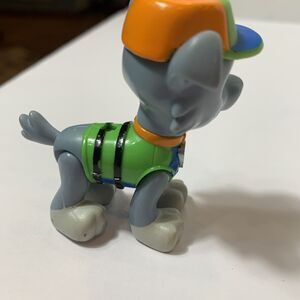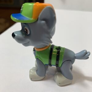 The product is a 2.5" action figure toy of Rocky from the "PAW Patrol" franchise. Rocky is a male dog character known for his role in rescuing missions. This plastic figurine features Rocky in his rescue outfit, emphasizing his recycling theme. The toy is part of the "Paw Patrol Rescue Pup" series and is suitable for both boys and girls who are fans of the "Paw Patrol" TV show. The brand behind this toy is Spin Master, and it is designed for play and collection by children who enjoy action figures and cartoon characters.