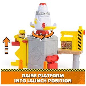 Get ready for an out-of-this-world adventure with the Rubble & Crew Launch & Spin Spaceship Playset! Take your favorite PAW Patrol Rubble figure through multiple play areas! Begin by placing Rubble on the launch platform on the left of the playset, then lift the platform to raise the rocket, hop into one of the rocket ships & push the button on top of the rocket to activate the spin action for some exciting dynamic play and endless fun! Afterwards, lift the platform on the right side to raise the carnival games kiosk to enjoy some thrilling pretend play, then lower the platform to reset the process and begin all over again!
