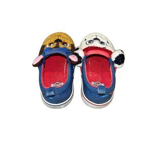 Adorable Paw Patrol slip on toddler shoes in size 5. These are for standard sized and maybe even more narrow feet. They have almost an embroidery look to it. Has Chase on one foot and Marshall on the other. They are definitely fuzzy feeling, but not like fur. Minor red stain on one of the eyes, but you really can't tell. Barely worn and have tons of life left in them.