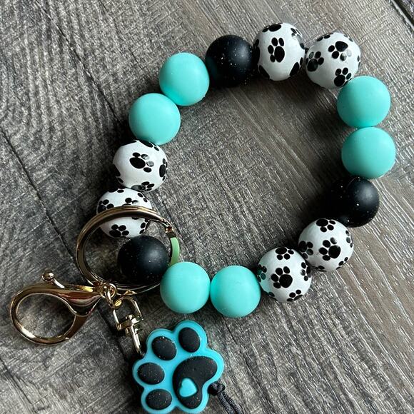 Teal paw print wristlet keychain featuring silicone and wooden beads. This bag charm is perfect for keeping your keys handy while showing your love for your furry friends. The wristlet design helps prevent lost keys, ideal for busy pet owners.
