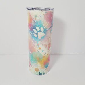 Celebrate your love for animals with this vibrant, one-of-a-kind tumbler! Featuring a playful pawprint surrounded by dreamy watercolor splashes, this 20 oz stainless steel tumbler is sublimated by Scott Heil of The Crowing Hen in Clayton, NC and co-owner Angie Bryan. Whether you're sipping coffee, tea, or your favorite cold drink, this tumbler adds personality and charm to every sip.