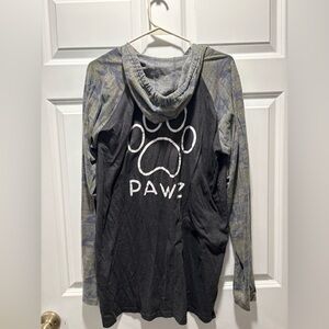 In great condition hooded long sleeve shirt from paws. Charcoal gray with camo sleeves. Size is x large, from smoke free home.