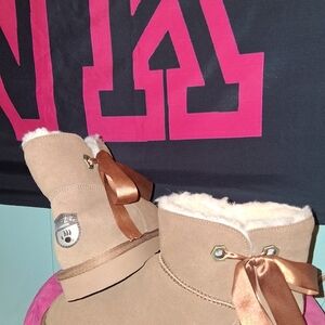 Stylish tan ankle boots Womens size 10 made by Bearpaw boots pawz edition, side tie,ribbon closure, Never worn, These are super cute and look very warm! Perfect for a cozy look and goes with everything. please lmk if you have any questions Thanks for checking out my closet Bundle to save ❤️