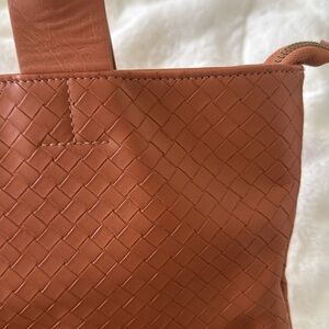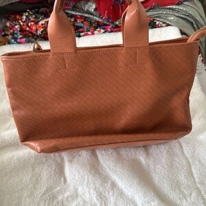 Cute little cognac tan brown tote purse with weaving design. Zips shut. Faux leather Measurements in photos