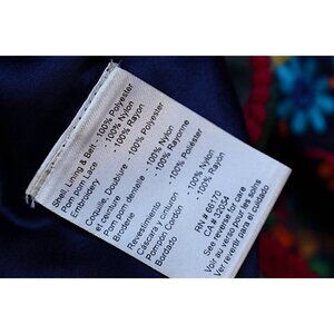 This is one of the most beautiful dresses ever sold at Anthro. Fabric has the texture of a silk shantung, but it is actually polyester so easier to care for.
