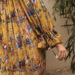 Launched from her home in Delhi, each of Payal Jain's dresses, tunics, and jumpsuits feature eclectic prints, saturated colors, and immaculate details that celebrate beauty and individuality. The natural, weightless character of these fabrics depicts the lightness of spirit, and emptiness of the soul. The color palette is vivid and vibrant, inspired by traditional Buddhist ‘Thangka’ paintings, in rich hues of Vermillion, Lapis blue, Emerald green and Sulphur yellow, with strokes from painted canvases.