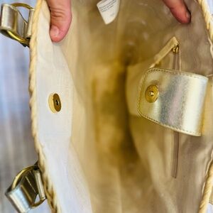The Payless Cornhusk Vintage Purse is a classic tote style handbag made from cornhusk with gold hardware accents. It features a woven pattern, button closure, and a top handle style in gold. The vintage design, along with the 90s theme, adds a unique touch to the purse. The interior is lined with fabric and includes inner pockets for organization. Perfect for casual occasions, this purse combines retro charm with contemporary style for a versatile accessory.