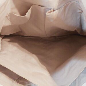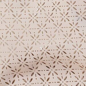 Made of vinyl and polyester. The front has etched flower pattern over a silver background. Handles have chain detailing. Measures 16 inches across and 11 inches tall. Handles are 24 inches.
