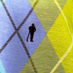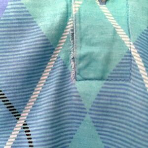 This golf ⛳️ Polo has a small imperfection.(See photo) Hardly noticeable. This shirt and it’s colors and argyle print are beautiful. Periwinkle, turquoise, lime green, with the striping in white and black. 100% Cotton.