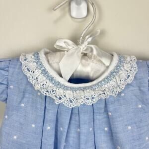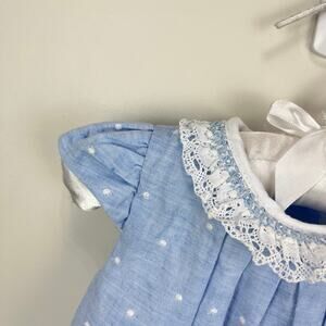 Paz Rodriguez Blue Dot Dress with Lace. Baby girl size 3 months. Made in Spain. Cap sleeve dress with pleated front. Ruffle lace collar and buttons down the back. Fully lined. Excellent condition. Original retail around $100.