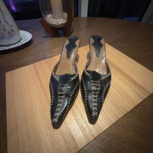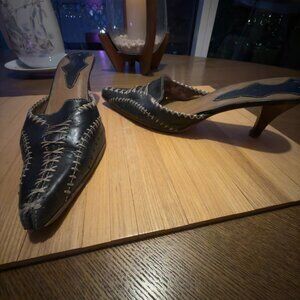 Unique and full of character, these Pazzio handcrafted leather mules are a statement piece for anyone who loves vintage-inspired footwear. Designed with pointed toes, intricate whipstitch detailing, and wooden kitten heels, they bring artisanal craftsmanship into everyday style.