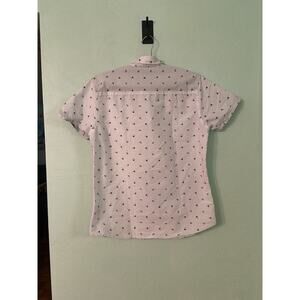 This Pd&c button-up shirt is perfect for a casual day out. The shirt features a white cotton fabric with palm trees and anchors in the background, giving it a nautical theme. The shirt has short sleeves, a collared neckline, and a button closure. It is a size M and has a standard fit, making it suitable for teens.