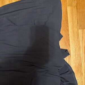 grey ribbed shell dress with a mock neck and long sleeves. It is a size medium and made from a blend of spandex and modal, ensuring a comfortable cozy fit. The dress falls past the knees, midi length and has an A-line style, making it perfect for both casual and formal occasions.