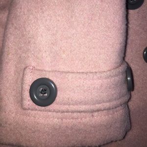 Pale pink pea coat with grey buttons on elbows and down middle.