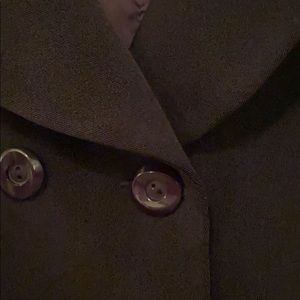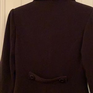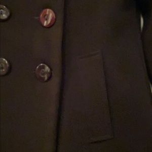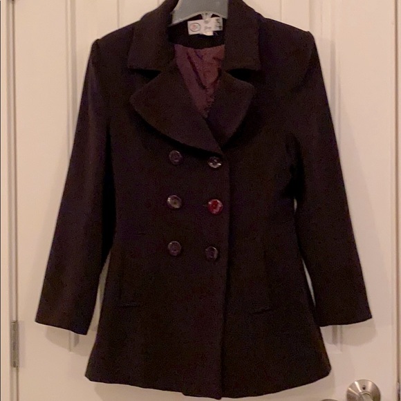 Cute pea coat in a slightly stretchy knit fabric color is brown with a plum cast to it in different light it can look deep plum. Front pockets button anchored “belt” across the back. Very good used condition.