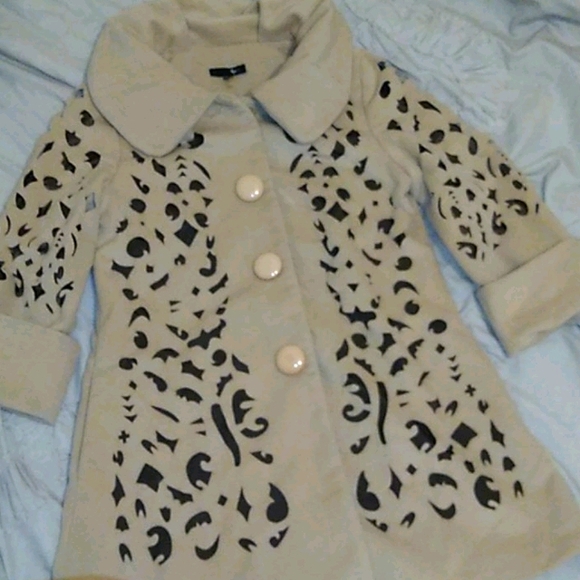 Beige, light weight, three button pea coat. Missing top button.