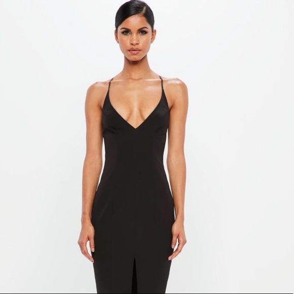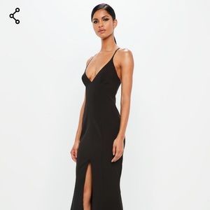 This is by Missguided’s Peace + Love high end brand // a formal black slip fishtail maxi dress // form-fitting // front slit // size 4 true to size // thin adjustable straps // low plunging neckline // material: polyester and elastane // perfect condition no flaws received many compliments / i am 5’5 and with high heels the dress hits right above the ground