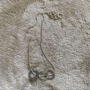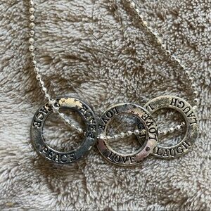 silver ring necklace with the words peace love laugh. some wear on rings view photos selling as is.