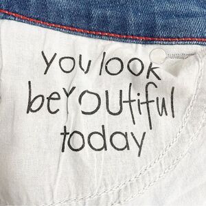 Distressed with front slit, contrast stitching, coin pocket, back pocket, large leather affirmation patch on back waistband, released hem with frayed edge.