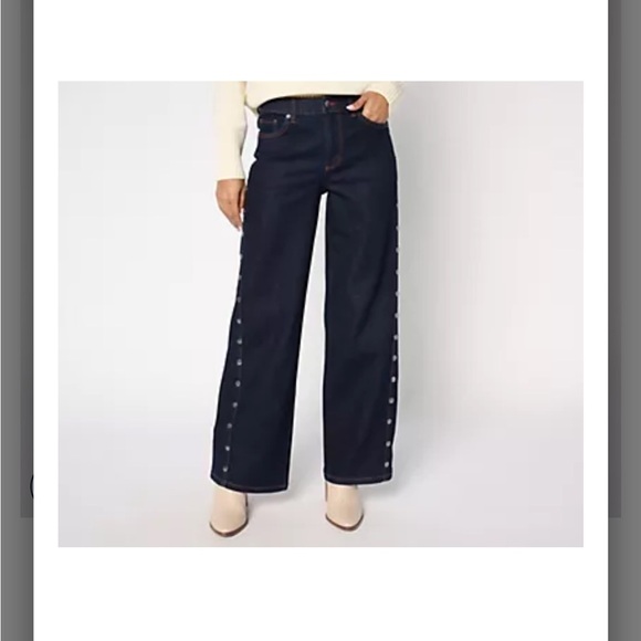 Hardware update! Rivets along some very flattering forward side seams give these wide-leg jeans that wow moment. From Peace Love World.