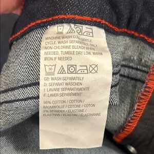 Hardware: zip fly and button closure, rivet details at forward-facing side seams