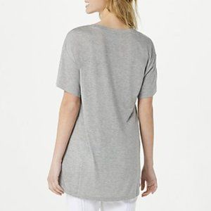 Features: V-neckline, short sleeves, dash embellishment above hem, heat seal logo inside back neckline