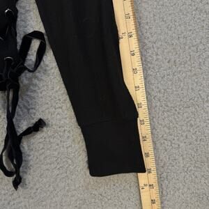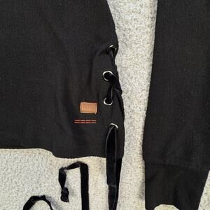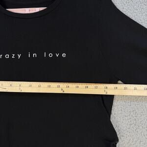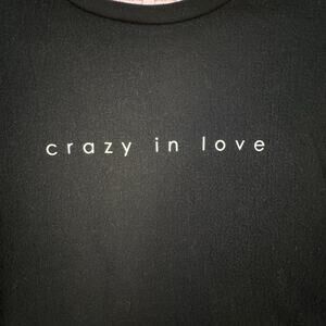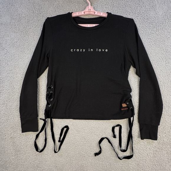 Peace Love World women’s black cropped sweatshirt featuring the phrase “Crazy in Love” across the front. Long sleeves with side lace-up detailing on both hips, each side finished with a tieable bow. Each side features eight metal eyelets and shoestring-style lace for an adjustable, statement look.