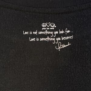 The back features the Peace Love World branding and quote centered at the neckline: “Love is not something you look for, love is something you become,” with signature-style artwork—soft, comfortable fabric with a relaxed, cropped fit.