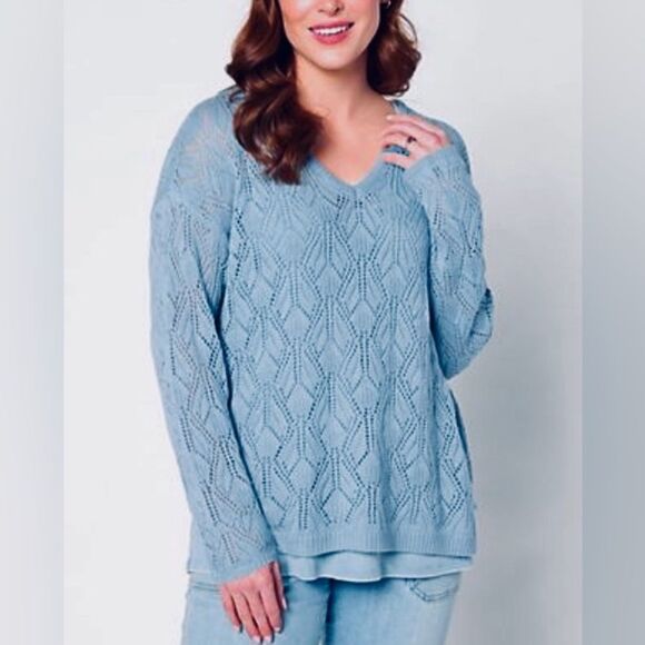 Peace Love World Women's Boheme Open-Stitch Novelty Sweater Blue. Size 1X
