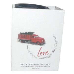 Peace On Earth Love Latte Mug w Lid 16 Oz Bone China Red Truck Design NIB NWT