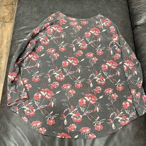 Peace & Pearls long sleeve waffle knit top with a vibrant floral pattern. Features red flowers on a dark background. P2P measurement is 25 inches