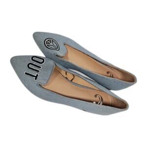 This product is a pair of women's slip-on flats with a low heel, featuring a peace sign design and a hippie hobo theme. The shoes are in size 9, with a blue-gray color and made of cotton material. The comfortable and stylish design makes them perfect for those looking for a casual and trendy footwear option that also aligns with a bohemian or hippie aesthetic.