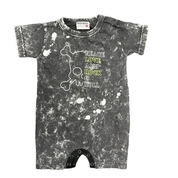 “Peace love and rock ‘n’ roll” tie-dye, gray onesie, Mish Boys, 6 months, New