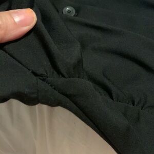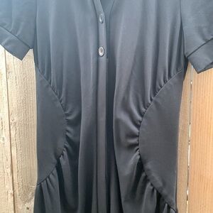 Great little black dress with a twist. Cool circles on sides buttons all the way down. All but top for buttons hidden.