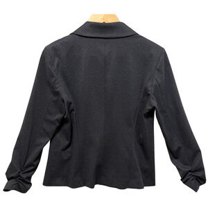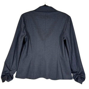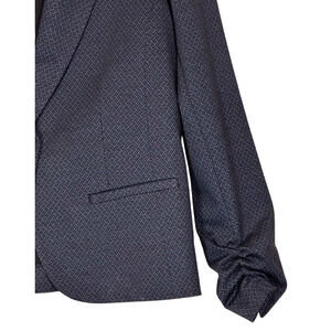 Peace of Cloth Gray Patterned Size 8 Single Button Stretch Blazer features a fitted silhouette with shirred sleeves and a subtle gray and blue pattern that makes it a timeless neutral that never goes out of style. It's never been worn and in flawless pre-owned condition!