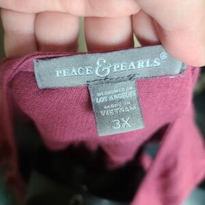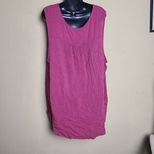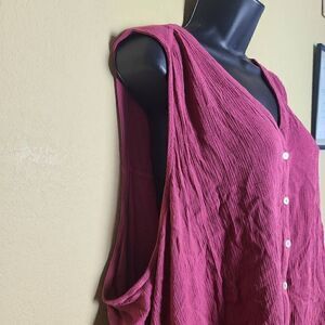 This is a blush colored sleeveless blouse by Peace & Pearls. It buttons down the front and has a front knot detail at the hem. This blouse is longer in the back than the front.