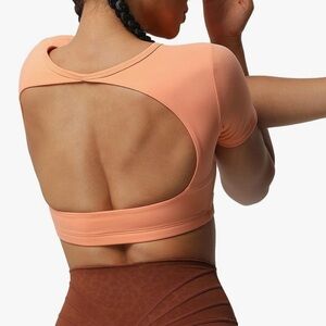 Athletic peach crop top perfect for a day at the gym or running. Features a unique cut-out design on back for added flair. Very cropped and compressed - Fits like size S.