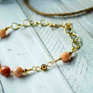 Peach Aventurine Bead Bracelet with Handmade Gold Chain Links