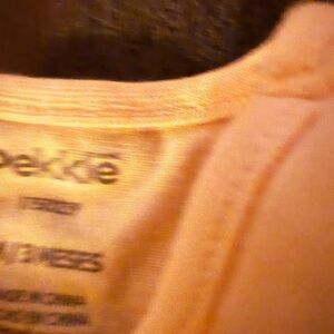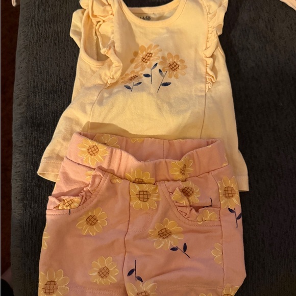 Charming baby outfit in a soft peach color. Features a lovely floral design.