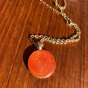 Peach Creamsicle Mica Powder Round Gold Medallion on 24 in Gold Plated Chain. Pendant measures 1.5 in H and 1 in W. Hand mixed and poured epoxy resin with natural mica powder.