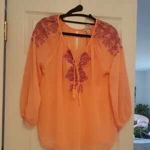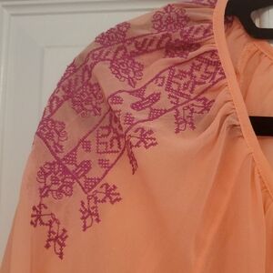 Stylish bright peachy women's blouse with intricate embroidery. Sheer light summer fabric.