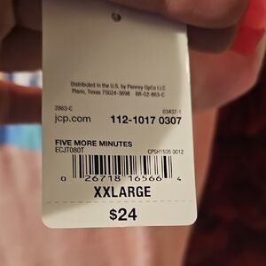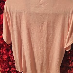 Peach V-neck tee featuring 'Five More Minutes' in colorful text. Perfect for casual wear.