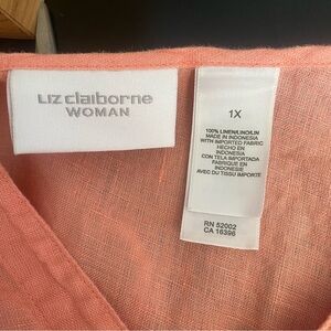 Lovely Liz Claiborne Woman peach linen blouse in a relaxed, breathable fit. Features a lightweight texture perfect for warm days and easy layering.
