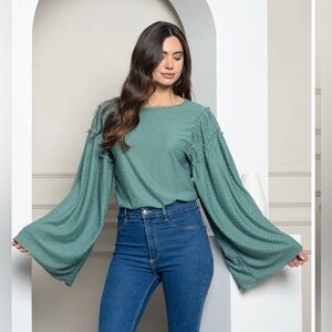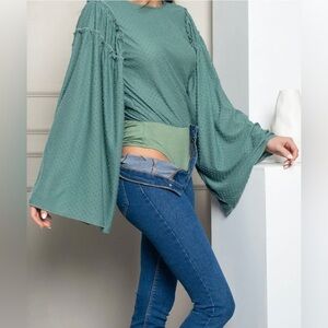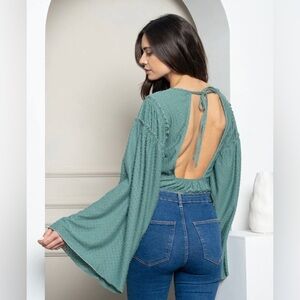 NWT! This item is brand new. It is a cute, trendy long bell sleeve open back bodysuit. Item comes in it’s original packaging.