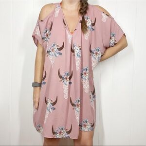 Peach Love Bull Skull Dress. Very loose Caftan Mini dress. Cold Shoulders. Boxy fot will fot up to a size large probably. Chest 34” length 33”. Size small.