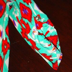 Pattern: Vibrant, abstract print in teal, red, purple, and white